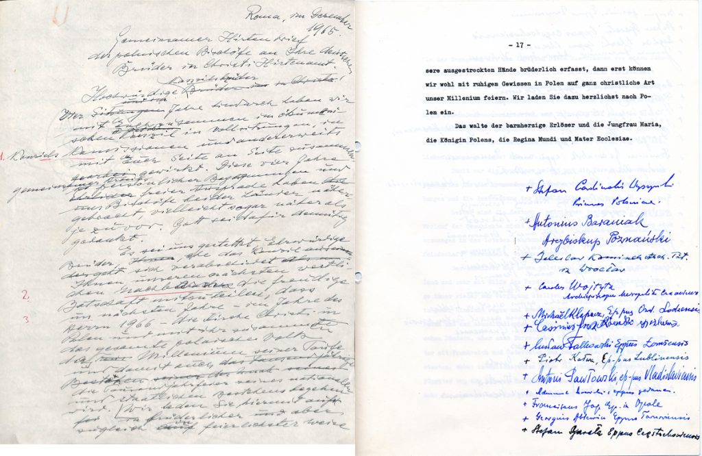 The Letter from the Polish bishops, originally entitled “Botschaft der polnischen Bischöfe an Ihre deutschen Brüder in Christi Hirtenamt” (The message of Polish bishops to their German brothers in Christ’s pastoral office), is a letter sent by the Polish bishops to the German bishops on 18 November 1965 during the last session of the Second Vatican Council. This document was an invitation for Germans to take part in the celebrations of the 1000th anniversary of Christianity in Poland, which was to occur in 1966. The invitation was originally a message that was to lay the foundations for Polish–German reconciliation and overcome hostility between the two nations resulting from the Second World War.